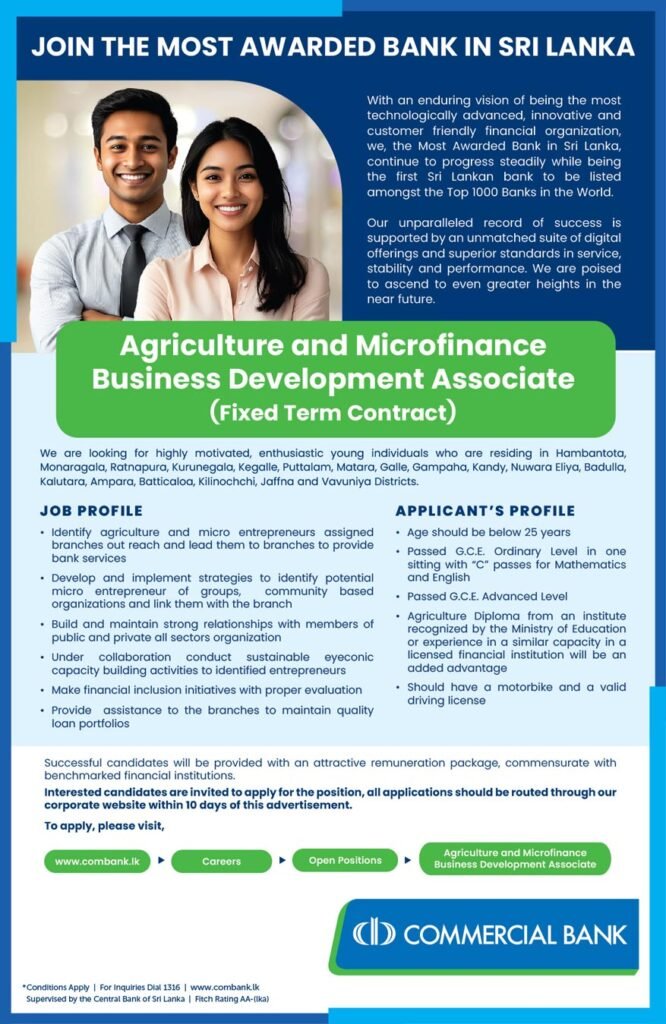Agriculture and Microfinance Business Development Associate Banking Sri Lanka April 6, 2026 LKR 30000 - LKR 70000 Contract Application ends: December 31, 2026 Apply Now Job Description Agriculture and Microfinance Business Development Associate Share this post Facebook Twitter LinkedIn Pinterest Related Jobs Retail Sales Associates (Fixed Term Contract) Banking Sri Lanka LKR 30000 - LKR 70000 Contract Marketing Associate – Leasing (Fixed Term Contract) Banking Sri Lanka LKR 30000 - LKR 70000 Contract Pawning Supervisor (Fixed Term Contract) Banking Sri Lanka LKR 30000 - LKR 70000 Contract