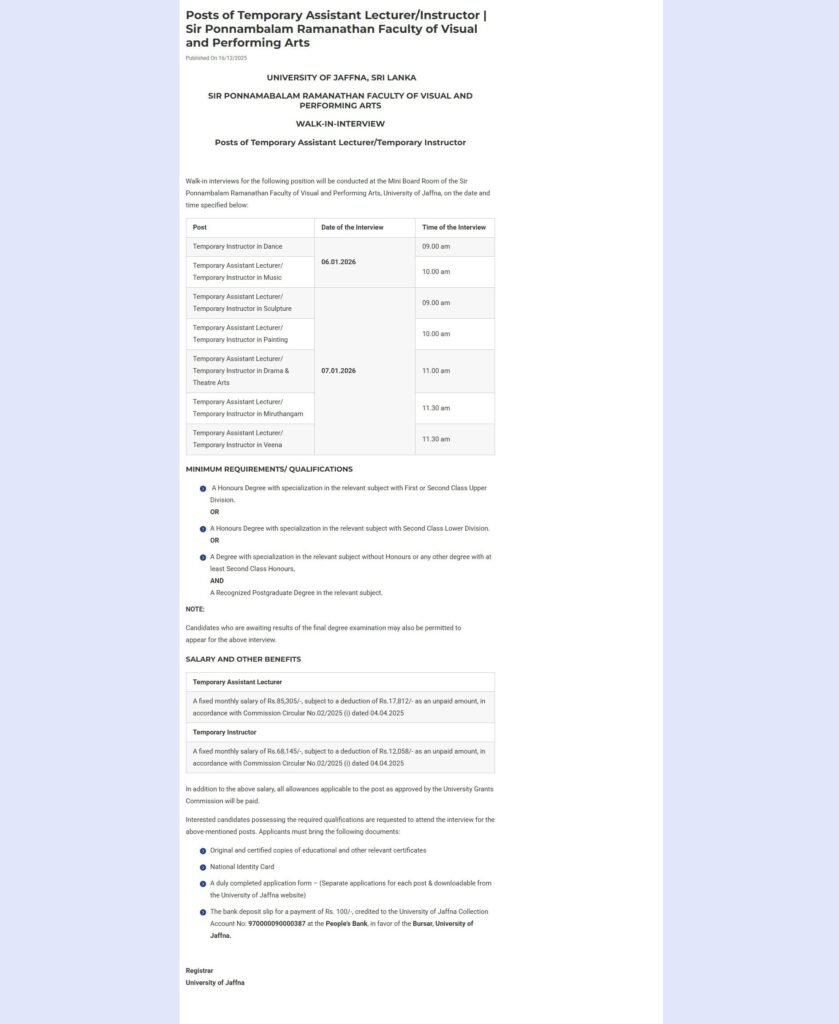 Assistant Lecturer, Demonstrator Administration, Assistant, Demonstration, Lecturer Sri Lanka, Jaffna LKR 85305 Full Time