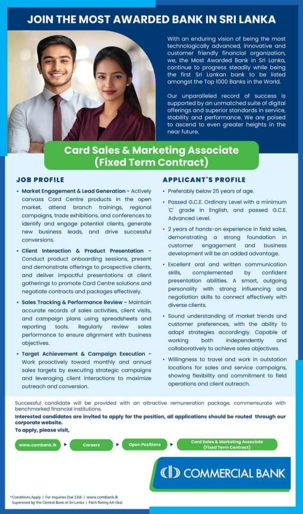 Card Sales & Marketing Associate (Fixed Term Contract) Banking, Sales Sri Lanka January 15, 2026 LKR 35000 - LKR 80000 Contract Application ends: January 22, 2026 Apply Now Job Description Card Sales & Marketing Associate (Fixed Term Contract) Share this post Facebook Twitter LinkedIn Pinterest