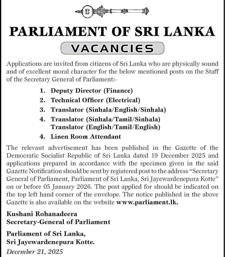 Deputy Director, Technical Officer, Translator Administration Sri Jayewardenepura, Sri Lanka December 24, 2025 LKR 50000 - LKR 100000 Full Time Application ends: January 5, 2026 Apply Now Job Description Deputy Director, Technical Officer, Translator Share this post Facebook Twitter LinkedIn Pinterest Related Jobs Executive – HRIS & HR Operations Administration, HR, Human Resource Sri Lanka LKR 80000 - LKR 120000 Full Time Assistant Manager – Financial Reporting Accounting / Finance, Administration Sri Lanka LKR 100000 - LKR 150000 Full Time Project Coordinator Administration, Coordinator, Project Management Batticaloa LKR 35000 - LKR 70000 Full Time Management Assistant, Director Administration, Management Assistant Sri Lanka, Colombo LKR 40000 - LKR 202000 Full Time Manager, Deputy General Manager, Secretary Administration Sri Lanka, Colombo LKR 50000 - LKR 215000 Full Time Coach, Chief Marshal Administration Sri Lanka, Colombo LKR 100000 - LKR 157000 Full Time Academic Warden Administration Sri Lanka Full Time Deputy General Manager Administration Sri Lanka, Colombo LKR 100000 - LKR 150000 Full Time Project Assistant Administration, Project Management Sri Lanka, Jaffna, Batticaloa LKR 40000 - LKR 80000 Full Time Office Assistant, Agri Business Development Specialist Administration Sri Lanka, Battaramulla LKR 40000 - LKR 100000 Full Time Dispensary Assistant, Center Manager Administration Sri Lanka, Peradeniya LKR 40000 - LKR 62000 Full Time Typesetter Administration Sri Lanka, Colombo LKR 30000 - LKR 70000 Full Time Occupational Therapist, Ophthalmic Technologist Administration Sri Lanka, Nugegoda LKR 35000 - LKR 84000 Full Time Demonstrator Administration, Demonstration Sri Lanka, Colombo LKR 40000 - LKR 70000 Full Time Chief Executive Officer Administration Sri Lanka, Katunayake LKR 1000000 - LKR 200000 Full Time Demonstrator Administration, Demonstration Sri Lanka, Colombo LKR 68145 Full Time Assistant Lecturer, Instructor Administration, Lecturer Sri Lanka, Jaffna LKR 85305 Full Time Director Administration Sri Lanka, Badulla LKR 100000 - LKR 200000 Full Time Accountant, Assistant General Manager Accountant, Administration Sri Lanka, Colombo LKR 81765 Full Time Office Employee Administration Yapanaya, Sri Lanka Full Time