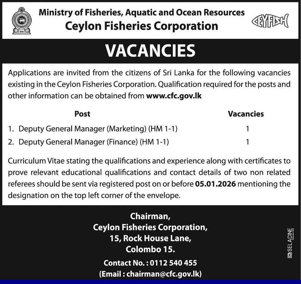 Deputy General Manager Administration Sri Lanka, Colombo December 24, 2025 LKR 100000 - LKR 150000 Full Time Application ends: January 5, 2026 Apply Now Job Description Deputy General Manager – Ceylon Fisheries Corporation Share this post Facebook Twitter LinkedIn Pinterest Related Jobs Executive – HRIS & HR Operations Administration, HR, Human Resource Sri Lanka LKR 80000 - LKR 120000 Full Time Assistant Manager – Financial Reporting Accounting / Finance, Administration Sri Lanka LKR 100000 - LKR 150000 Full Time Project Coordinator Administration, Coordinator, Project Management Batticaloa LKR 35000 - LKR 70000 Full Time Management Assistant, Director Administration, Management Assistant Sri Lanka, Colombo LKR 40000 - LKR 202000 Full Time Manager, Deputy General Manager, Secretary Administration Sri Lanka, Colombo LKR 50000 - LKR 215000 Full Time Coach, Chief Marshal Administration Sri Lanka, Colombo LKR 100000 - LKR 157000 Full Time Academic Warden Administration Sri Lanka Full Time Deputy Director, Technical Officer, Translator Administration Sri Jayewardenepura, Sri Lanka LKR 50000 - LKR 100000 Full Time Project Assistant Administration, Project Management Sri Lanka, Jaffna, Batticaloa LKR 40000 - LKR 80000 Full Time Office Assistant, Agri Business Development Specialist Administration Sri Lanka, Battaramulla LKR 40000 - LKR 100000 Full Time Dispensary Assistant, Center Manager Administration Sri Lanka, Peradeniya LKR 40000 - LKR 62000 Full Time Typesetter Administration Sri Lanka, Colombo LKR 30000 - LKR 70000 Full Time Occupational Therapist, Ophthalmic Technologist Administration Sri Lanka, Nugegoda LKR 35000 - LKR 84000 Full Time Demonstrator Administration, Demonstration Sri Lanka, Colombo LKR 40000 - LKR 70000 Full Time Chief Executive Officer Administration Sri Lanka, Katunayake LKR 1000000 - LKR 200000 Full Time Demonstrator Administration, Demonstration Sri Lanka, Colombo LKR 68145 Full Time Assistant Lecturer, Instructor Administration, Lecturer Sri Lanka, Jaffna LKR 85305 Full Time Director Administration Sri Lanka, Badulla LKR 100000 - LKR 200000 Full Time Accountant, Assistant General Manager Accountant, Administration Sri Lanka, Colombo LKR 81765 Full Time Office Employee Administration Yapanaya, Sri Lanka Full Time