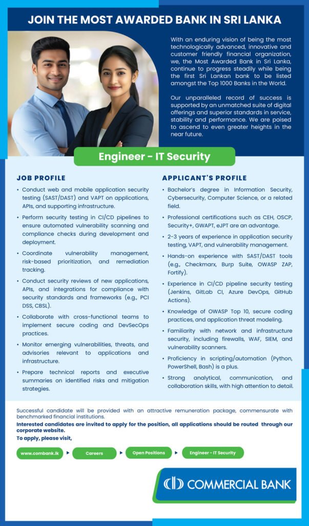 Engineer – IT Security Banking, IT Sri Lanka November 6, 2025 LKR 100000 - LKR 150000 Full Time Application ends: November 16, 2025 Apply Now Job Description Engineer – IT Security Share this post Facebook Twitter LinkedIn Pinterest Related Jobs Customer Success Associate IT Colombo LKR 90000 - LKR 100000 Full Time Project Management Associate IT Colombo LKR 80000 - LKR 100000 Full Time Social Media Account Management Executive IT Colombo LKR 80000 - LKR 100000 Full Time Program Manager – Aesthetics Consulting Business IT Colombo LKR 100000 - LKR 120000 Full Time Senior Executive – Event Presenter IT Colombo LKR 100000 - LKR 120000 Full Time Executive / Senior Executive – Talent Acquisition Banking, Finance Colombo LKR 100000 - LKR 120000 Full Time Walk In Interview – Trainee Marketing Executive / Marketing Executive Banking, Finance Trincomalee LKR 70000 - LKR 100000 Full Time Gold Loan Officer Banking, Finance Wellawatte LKR 30000 - LKR 50000 Full Time Gold Loan Officer Banking, Finance Maharagama, Battaramulla LKR 30000 - LKR 50000 Full Time Gold Loan Officer Banking, Finance Jaffna LKR 30000 - LKR 50000 Full Time Gold Loan Officer Banking, Finance Colombo LKR 30000 - LKR 50000 Full Time Relationship Officer Banking Naula, Maha Oya, Buttala LKR 50000 - LKR 800000 Full Time Assistant Relationship Manager Banking Kurunegala LKR 100000 - LKR 150000 Full Time Manager/Senior Manager- Corporate Legal Banking Colombo LKR 100000 - LKR 200000 Full Time Chief Manager Banking Sri Lanka LKR 70000 - LKR 100000 Full Time Pawning Associate Banking Sri Lanka LKR 70000 - LKR 100000 Full Time