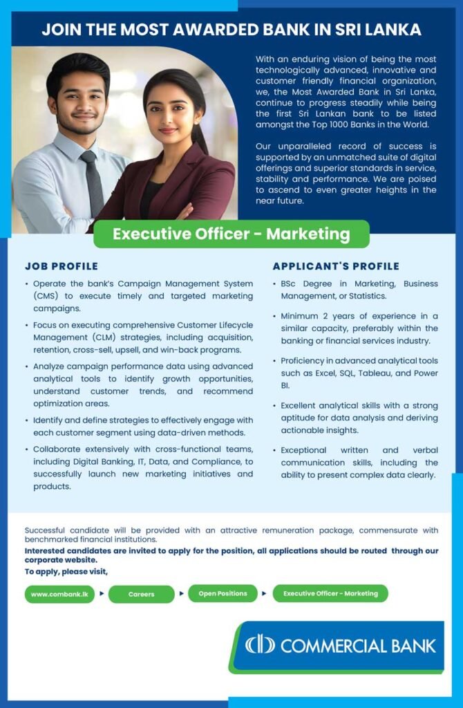 Executive Officer – Marketing Banking, Marketing Sri Lanka January 15, 2026 LKR 80000 - LKR 150000 Full Time Application ends: January 18, 2026 Apply Now Job Description Executive Officer – Marketing Share this post Facebook Twitter LinkedIn Pinterest Related Jobs Information Security Analyst (GRC Analyst) Banking, IT Sri Lanka LKR 40000 - LKR 80000 Full Time Marketing & Sales Administrator – Card Centre (Fixed Term Contract) Administration, Banking, Sales Sri Lanka LKR 35000 - LKR 80000 Full Time Executive Assistant – Islamic Banking Unit Banking Sri Lanka LKR 80000 - LKR 150000 Full Time Trainee Banking Assistants Banking Sri Lanka LKR 20000 - LKR 40000 Full Time