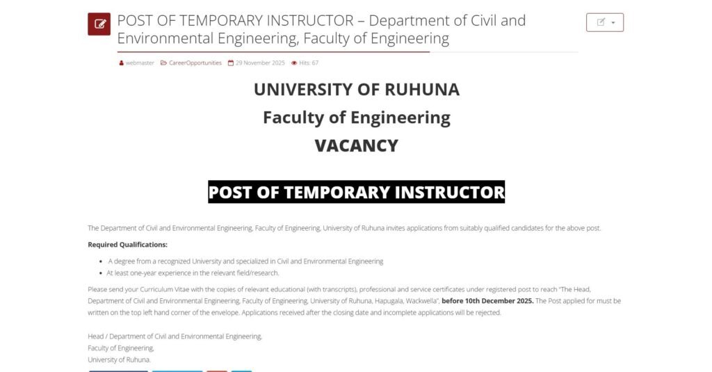 Instructor Instructor Matara December 1, 2025 LKR 60000 - LKR 80000 Full Time Application ends: December 10, 2025 Apply Now Job Description Instructor – University of Ruhuna Share this post Facebook Twitter LinkedIn Pinterest Related Jobs Management Assistant, Senior Lecturer, Instructor Instructor, Lecturer, Management Assistant Anuradhapura LKR 60000 - LKR 80000 Full Time