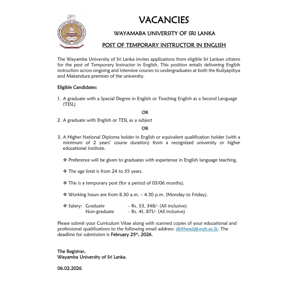 Instructor Administration Sri Lanka February 11, 2026 LKR 40000 - LKR 55000 Full Time Application ends: February 25, 2026 Apply Now Job Description Instructor Share this post Facebook Twitter LinkedIn Pinterest Related Jobs Head of Administration, Chief Financial Officer Administration Sri Lanka, Colombo LKR 50000 - LKR 150000 Full Time Individual Consultant Administration Sri Lanka, Colombo LKR 100000 - LKR 200000 Full Time Director Administration Sri Lanka LKR 100000 - LKR 150000 Full Time Lecturer, Director, Accompanist Administration, Lecturer Sri Lanka LKR 90000 - LKR 187000 Full Time Book Keeper Administration Sri Lanka LKR 40000 - LKR 50000 Full Time Director, Accounts Officer, Administrative Officer Accountant, Administration Sri Lanka LKR 186000 - LKR 200000 Full Time CORPORATE LEGAL MANAGER Administration Colombo LKR 150000 - LKR 200000 Full Time Sales Executive Administration, Sales Colombo LKR 100000 - LKR 150000 Full Time