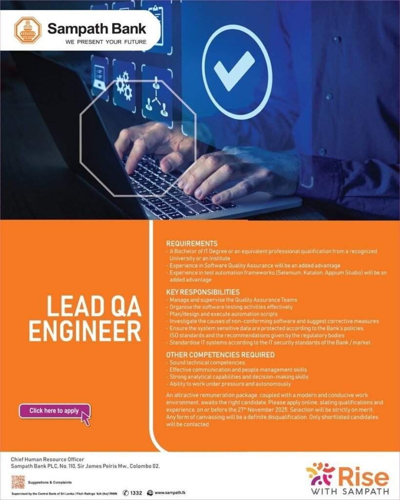 Lead QA Engineer Banking, IT Sri Lanka, Colombo November 19, 2025 LKR 100000 - LKR 200000 Full Time Application ends: December 30, 2025 Apply Now Job Description Lead QA Engineer Share this post Facebook Twitter LinkedIn Pinterest Related Jobs Senior Deputy Manager / Policy & Framework and Business Advisory Financial Crime Compliance Banking Sri Lanka LKR 100000 - LKR 200000 Full Time Assistant Relationship Manager / Executive Banking Anuradhapura LKR 100000 - LKR 150000 Full Time Relationship Officer Banking Kekirawa LKR 60000 - LKR 100000 Full Time Officer In Charge Banking Buttala LKR 100000 - LKR 150000 Full Time Business Development Officer / Executive Banking Kandy LKR 60000 - LKR 100000 Full Time Manager / Senior Manager Banking Sri Lanka LKR 100000 - LKR 200000 Full Time Manager Banking Sri Lanka LKR 100000 - LKR 200000 Full Time Senior Banking Assistant Banking Kuliyapitiya LKR 80000 - LKR 120000 Full Time Senior Banking Assistant Banking Kekirawa LKR 80000 - LKR 120000 Full Time Internship Banking Sri Lanka LKR 15000 - LKR 20000 Full Time internship Branch Manager Banking Sri Lanka, Moratuwa LKR 100000 - LKR 200000 Full Time Junior Executive Banking Vavuniyawa, Sri Lanka, Mannar LKR 80000 - LKR 100000 Full Time Regional Manager Banking Sri Lanka LKR 100000 - LKR 200000 Full Time Business Relationship Officer Banking Nawam LKR 60000 - LKR 100000 Full Time Branch Pawning Officers Banking Nawam LKR 60000 - LKR 100000 Full Time Senior Banking Associate / Junior Executive Banking Sri Lanka, Colombo LKR 100000 - LKR 200000 Full Time Officer In Charge Banking Narahenpita LKR 100000 - LKR 150000 Full Time Officer In Charge Banking Akuressa LKR 100000 - LKR 150000 Full Time Officer In Charge Banking Batticaloa LKR 100000 - LKR 150000 Full Time Junior Executive Banking Sri Lanka, Colombo LKR 60000 - LKR 100000 Full Time