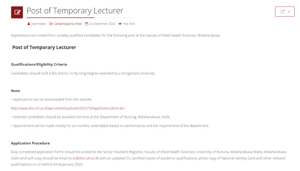 Lecturer Administration, Lecturer Sri Lanka December 28, 2025 LKR 50000 - LKR 100000 Full Time Application ends: January 2, 2026 Apply Now Job Description Lecturer Share this post Facebook Twitter LinkedIn Pinterest Related Jobs Secretary Administration Sri Lanka, Colombo LKR 100000 - LKR 122970 Full Time Customer Care Officer Administration Sri Lanka, Colombo LKR 100000 - LKR 122970 Full Time Deputy Director Administration Sri Lanka, Colombo LKR 100000 - LKR 150000 Full Time Officer In Charge Administration Sri Lanka, Halawatha LKR 40000 - LKR 50000 Full Time Engineering Assistant, Senior Engineering Assistant Administration, Engineering Sri Lanka, Colombo LKR 50000 - LKR 123000 Full Time Deputy General Manager, Assistant General Manager Administration Sri Lanka, Colombo LKR 50000 - LKR 200000 Full Time Driver Administration, Driving Sri Lanka, Colombo LKR 35000 - LKR 67000 Full Time Management Assistant Administration, Management Assistant Sri Lanka, Colombo LKR 35000 - LKR 83000 Full Time Culinary Instructor / Lecturer FMCG, Lecturer Sri Lanka, Moratuwa LKR 40000 - LKR 90000 Full Time Manager / Senior Manager – Actuarial Administration, Assurance Sri Lanka LKR 100000 - LKR 200000 Full Time Health Service Aid Administration, Health and Care Sri Lanka LKR 40000 - LKR 70000 Full Time Driver, Office Aide Administration, Driving Sri Lanka, Kelaniya LKR 35000 - LKR 67000 Full Time Management Assistant, Technical Officer, Works Aide Administration, Management Assistant, Technical Galle LKR 35000 - LKR 100000 Full Time Map Technological Officer, Photogrammetric Technician, Litho Technician Administration, Technical Sri Lanka, Colombo LKR 50000 - LKR 120000 Full Time Survey Instrument Technician Administration, Technical Sri Lanka, Colombo LKR 50000 - LKR 85000 Full Time Executive – HRIS & HR Operations Administration, HR, Human Resource Sri Lanka LKR 80000 - LKR 120000 Full Time Assistant Manager – Financial Reporting Accounting / Finance, Administration Sri Lanka LKR 100000 - LKR 150000 Full Time Project Coordinator Administration, Coordinator, Project Management Batticaloa LKR 35000 - LKR 70000 Full Time Management Assistant, Director Administration, Management Assistant Sri Lanka, Colombo LKR 40000 - LKR 202000 Full Time Manager, Deputy General Manager, Secretary Administration Sri Lanka, Colombo LKR 50000 - LKR 215000 Full Time