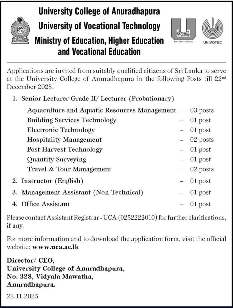 Senior Lecturer, Lab Assistant, Management Assistant Administration, Lecturer, Management Assistant Kuliyapitiya LKR 189120 - LKR 200000 Full Time