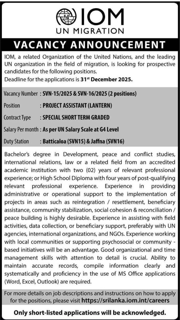 Project Assistant Administration, Project Management Sri Lanka, Jaffna, Batticaloa December 24, 2025 LKR 40000 - LKR 80000 Full Time Application ends: December 31, 2025 Apply Now Job Description Project Assistant – International Organization for Migration (IOM) Share this post Facebook Twitter LinkedIn Pinterest Related Jobs Executive – HRIS & HR Operations Administration, HR, Human Resource Sri Lanka LKR 80000 - LKR 120000 Full Time Assistant Manager – Financial Reporting Accounting / Finance, Administration Sri Lanka LKR 100000 - LKR 150000 Full Time Project Coordinator Administration, Coordinator, Project Management Batticaloa LKR 35000 - LKR 70000 Full Time Management Assistant, Director Administration, Management Assistant Sri Lanka, Colombo LKR 40000 - LKR 202000 Full Time Manager, Deputy General Manager, Secretary Administration Sri Lanka, Colombo LKR 50000 - LKR 215000 Full Time Coach, Chief Marshal Administration Sri Lanka, Colombo LKR 100000 - LKR 157000 Full Time Academic Warden Administration Sri Lanka Full Time Deputy General Manager Administration Sri Lanka, Colombo LKR 100000 - LKR 150000 Full Time Deputy Director, Technical Officer, Translator Administration Sri Jayewardenepura, Sri Lanka LKR 50000 - LKR 100000 Full Time Office Assistant, Agri Business Development Specialist Administration Sri Lanka, Battaramulla LKR 40000 - LKR 100000 Full Time Dispensary Assistant, Center Manager Administration Sri Lanka, Peradeniya LKR 40000 - LKR 62000 Full Time Typesetter Administration Sri Lanka, Colombo LKR 30000 - LKR 70000 Full Time Occupational Therapist, Ophthalmic Technologist Administration Sri Lanka, Nugegoda LKR 35000 - LKR 84000 Full Time Demonstrator Administration, Demonstration Sri Lanka, Colombo LKR 40000 - LKR 70000 Full Time Chief Executive Officer Administration Sri Lanka, Katunayake LKR 1000000 - LKR 200000 Full Time Demonstrator Administration, Demonstration Sri Lanka, Colombo LKR 68145 Full Time Assistant Lecturer, Instructor Administration, Lecturer Sri Lanka, Jaffna LKR 85305 Full Time Director Administration Sri Lanka, Badulla LKR 100000 - LKR 200000 Full Time Accountant, Assistant General Manager Accountant, Administration Sri Lanka, Colombo LKR 81765 Full Time Office Employee Administration Yapanaya, Sri Lanka Full Time