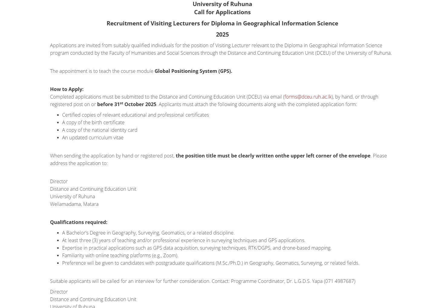 Visiting Lecturer Lecturer Sri Lanka, Colombo October 28, 2025 LKR 100000 - LKR 150000 Full Time Government Application deadline closed. Job Description Visiting Lecturer 68fc1fa7d8f5b.png Share this post Facebook Twitter LinkedIn Pinterest Related Jobs Senior Lecturer, Lecturer Lecturer Sri Lanka, Moratuwa LKR 187820 - LKR 200000 Full Time Government Senior Lecturer Lecturer Sri Lanka, Colombo LKR 85000 - LKR 150000 Contract Government Assistant Lecturer Lecturer Sri Lanka, Mihintale LKR 67494 - LKR 100000 Government Temporary Lecturer Lecturer Sri Lanka, Colombo LKR 70000 - LKR 100000 Full Time Government